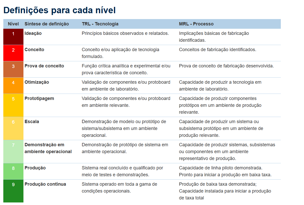 É justamente para organizar esse processo que existe a escala de Níveis de Maturidade Tecnológica (TRL – Technology Readiness Level), que visa padronizar o entendimento acerca da evolução de uma tecnologia entre instituições de pesquisa em todo o mundo. Essa escala ajuda a entender em que ponto uma tecnologia está: da ideia inicial (TRL 1) até a plena operação comercial (TRL 9).