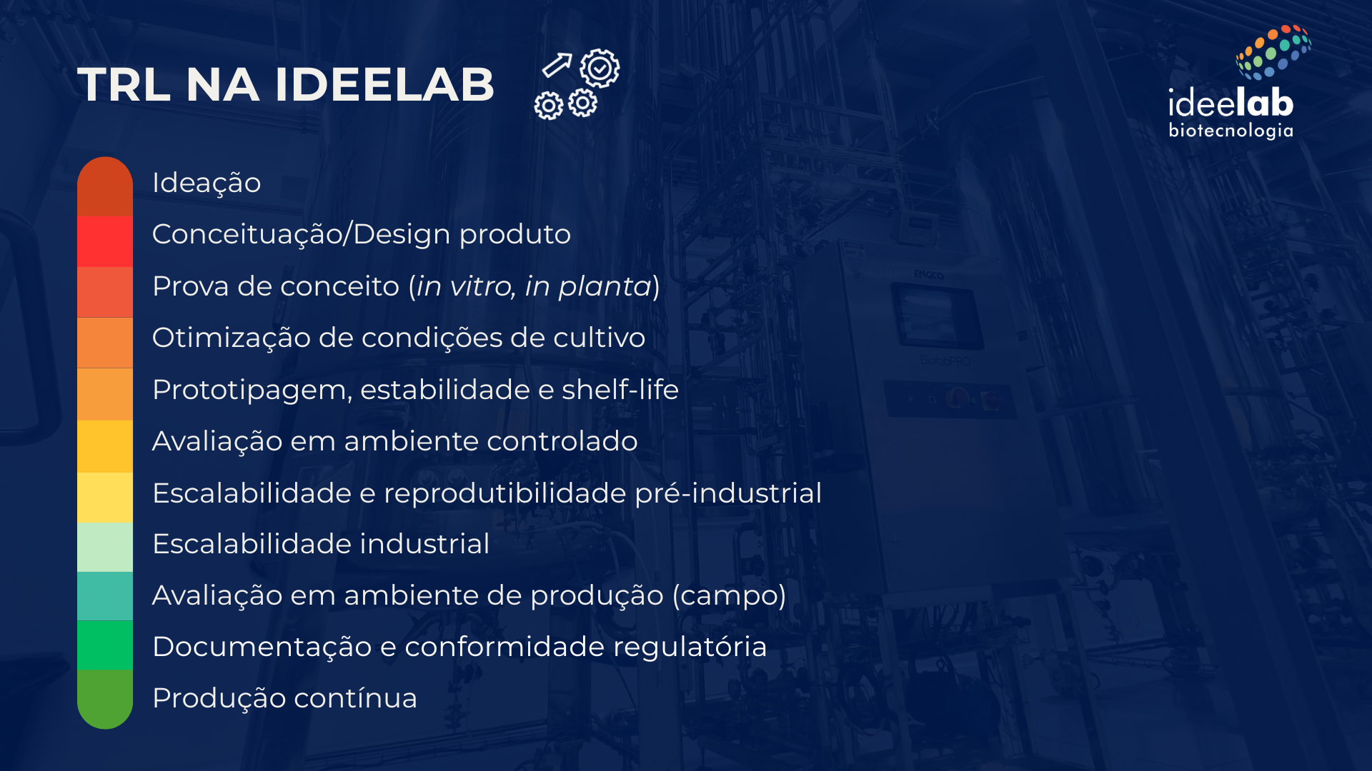 A escala TRL é uma bússola que mostra o nível de maturidade da sua formulação. Mas é a IdeeLab que transforma essa métrica em realidade: desenvolvendo, validando e produzindo bioinsumos de forma integrada e estratégica.